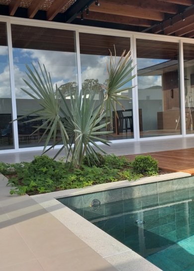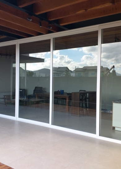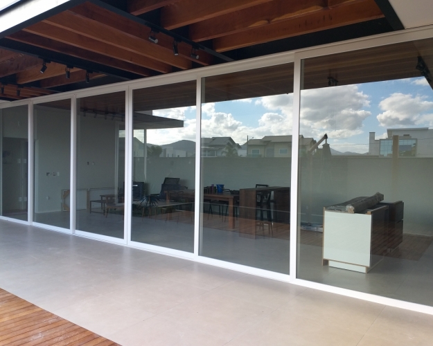 Porta de correr 6 folhas móveisPara projetos mais arrojados com grandes vãos a porta de correr 6 folhas é uma boa opção. Com a movimentação de 4 folhas do centro para as laterais conseguimos uma abertura de vão de 66%.