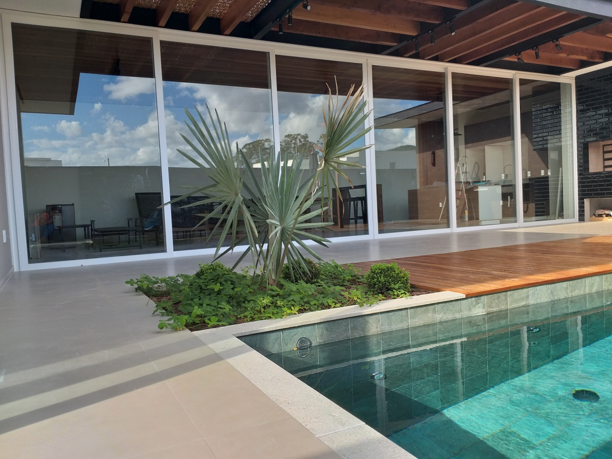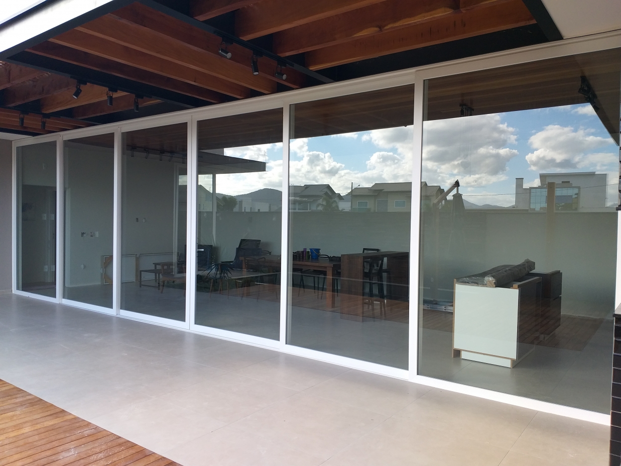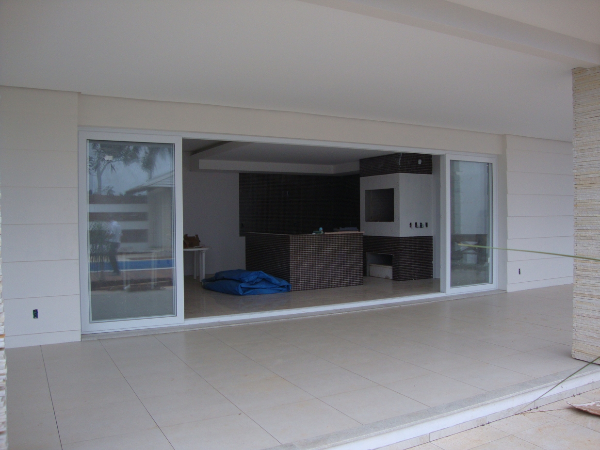 Porta de correr 6 folhas móveisPara projetos mais arrojados com grandes vãos a porta de correr 6 folhas é uma boa opção. Com a movimentação de 4 folhas do centro para as laterais conseguimos uma abertura de vão de 66%.